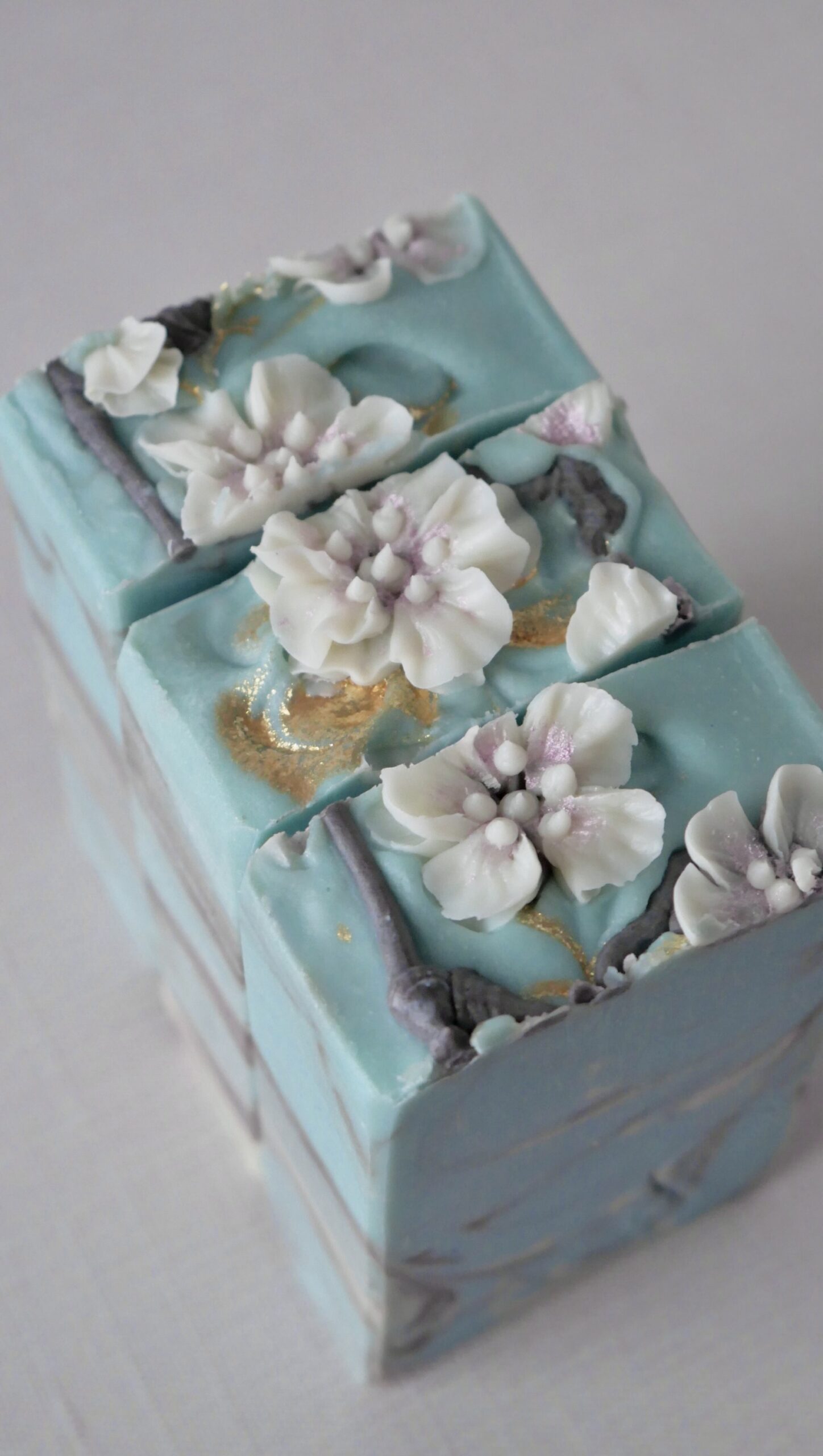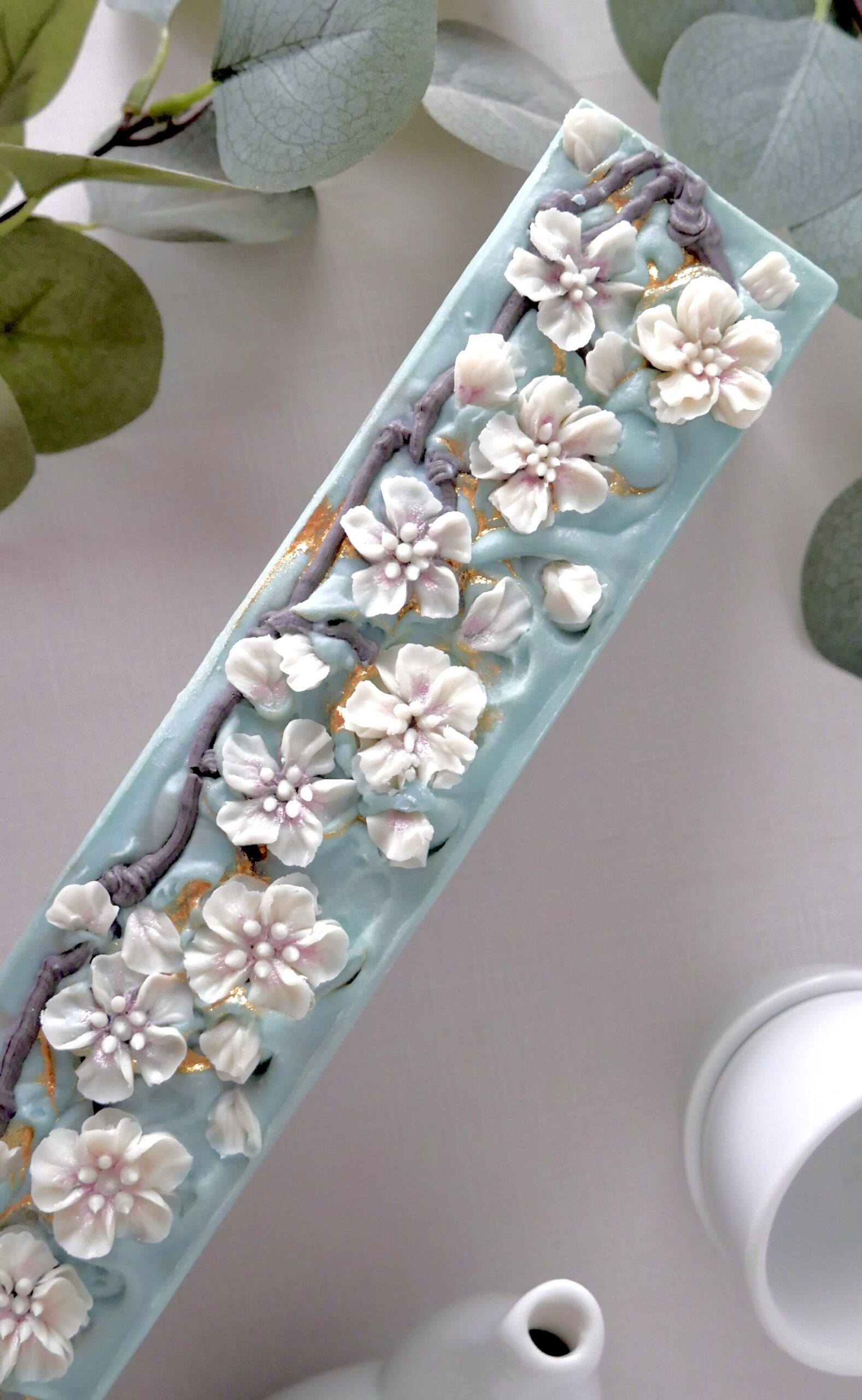 Each bar is adorned with hand-piped cherry blossom petals and flowers atop an aqua blue base, accented with cream and chocolate brown in-the-pot swirls.