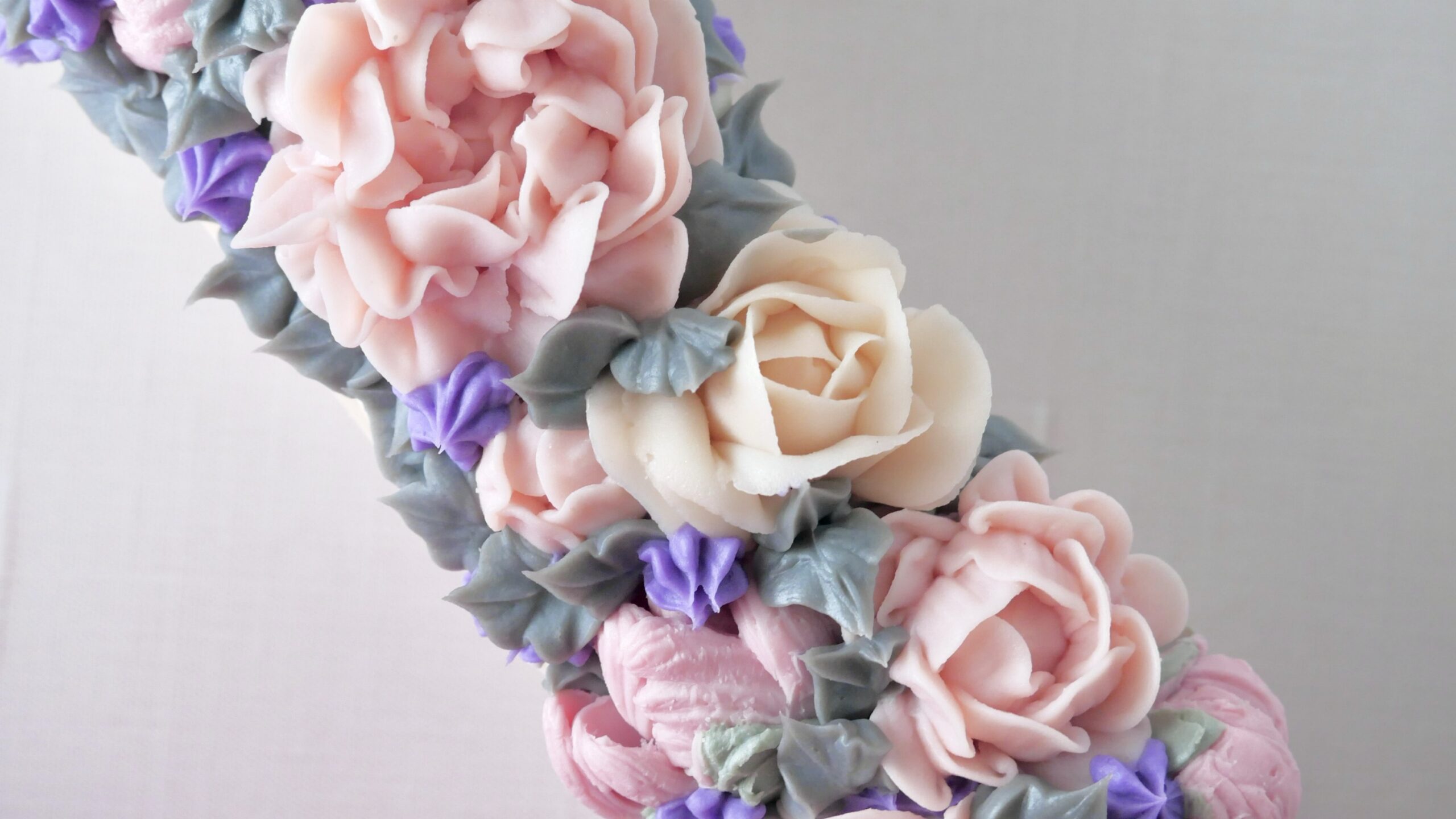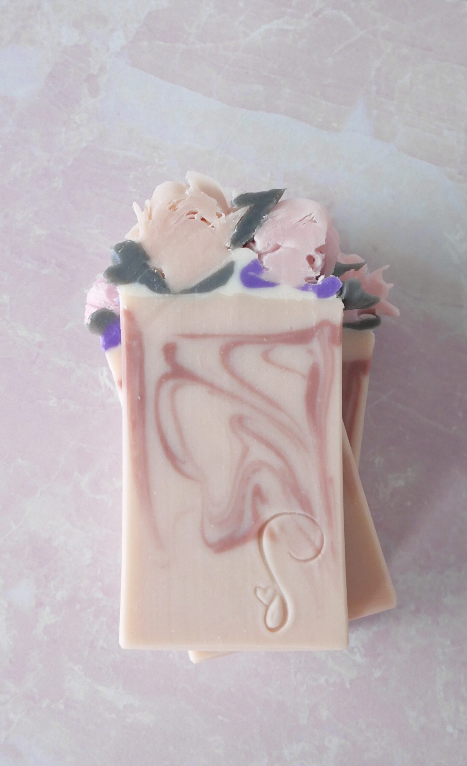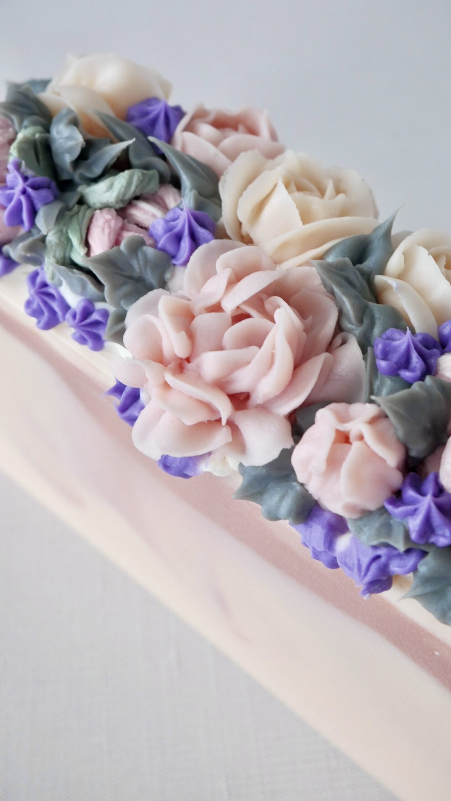 Finished with hand-piped peonies and roses atop a pale creamy pink base with a dusty rose swirl, this bar is as beautiful as it is nourishing.