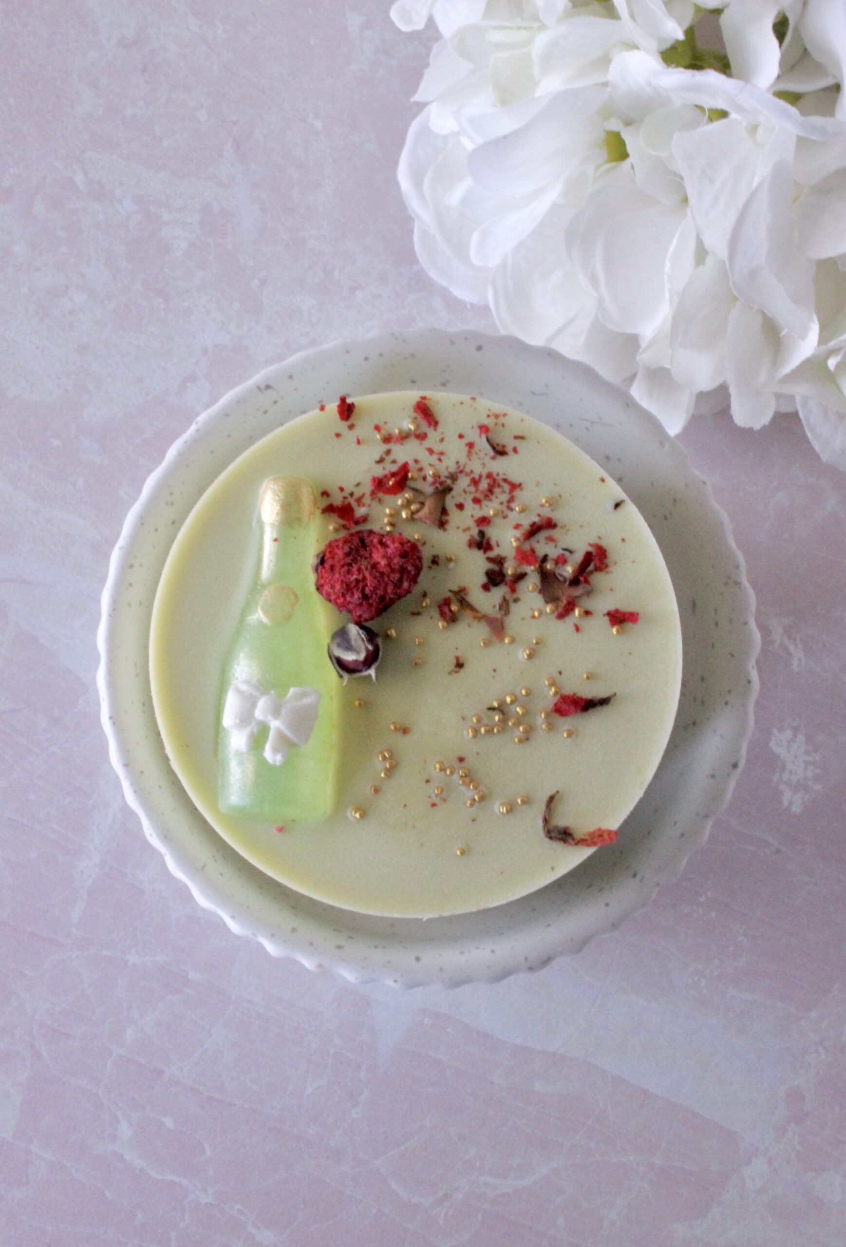 Coconut Oil, Palm Oil, Distilled Water, Olive Oil, Rice Bran Oil, Sodium Hydroxide, Coconut Milk, Cocoa Butter, Shea Butter, Castor Seed Oil, Sunflower Oil, Fragrance, Kaolin Clay, Dried Rose Bud, Dried Pomegranante Flower, Mica, Titanium Dioxide ,*Glycerin Prosecco Bottle, ** Bursting Beads, Salt, Tussah Silk.